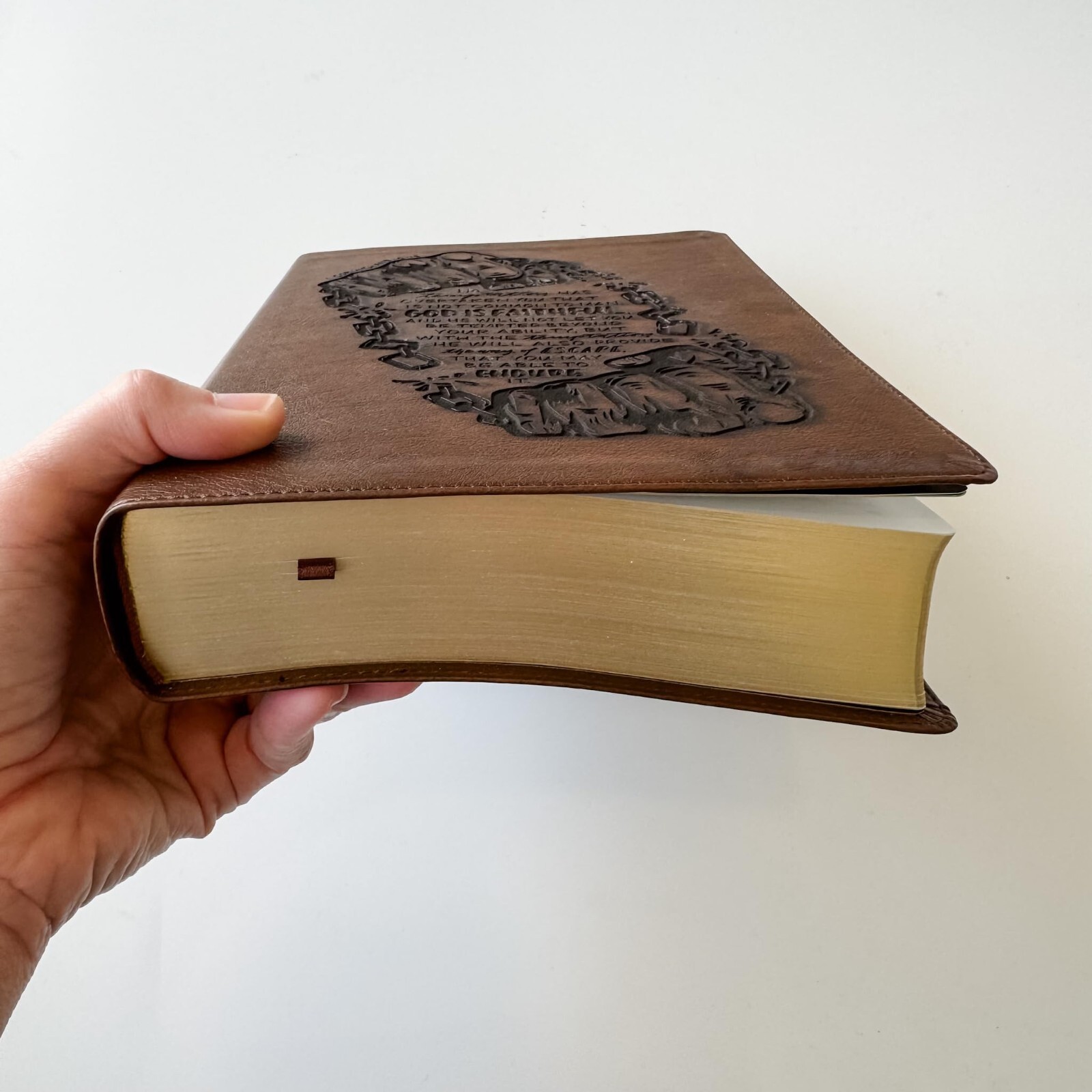 This is a brown NLT Life Recovery Bible. The Bible for people in 12 step recovery. Features hand lettered engraving of 1 Corinthians 10:13 - "No temptation has overtaken you that is not common to man.